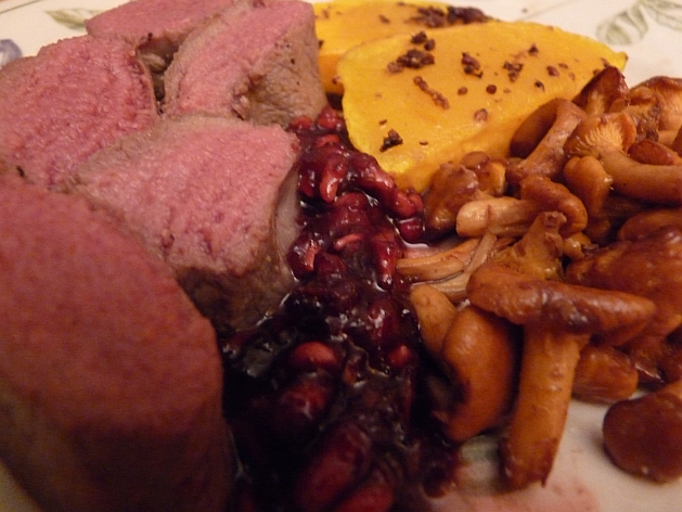 Rehfilet mit pfeffriger Granatapfel-Portweinsauce, Pfifferlingen und gebackenen Kürbisspalten |