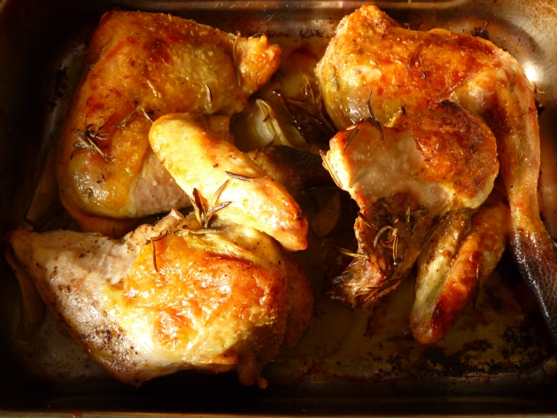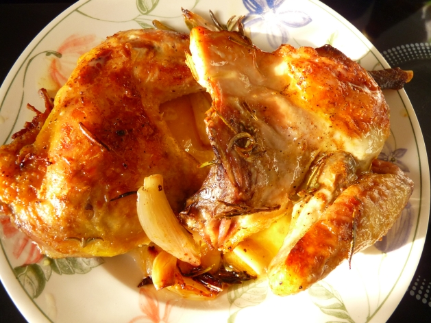 Hinweis zur Portionsangabe: da an einem durchschnittlichen Perlhuhn deutlich weniger Fleisch dran ist als an den üblichen Hähnchen, dürften 4 Personen von einem Huhn nicht satt werden. |